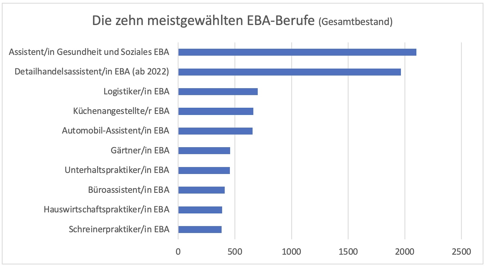 Die am häufigsten gewählten EBA-Berufe sind Assistentin und Assistent Gesundheit und Soziales und Detailhandelsassistentin und -assistent. Wie bei den Grundbildungen mit EFZ gibt es eine Vielzahl EBA-Grundbildungen, die nur wenige Lernende pro Jahr ausbilden. Rund ein Drittel der EBA-Berufe haben durchschnittlich weniger als zehn Lernende pro Lehrjahr (BFS 2024b).