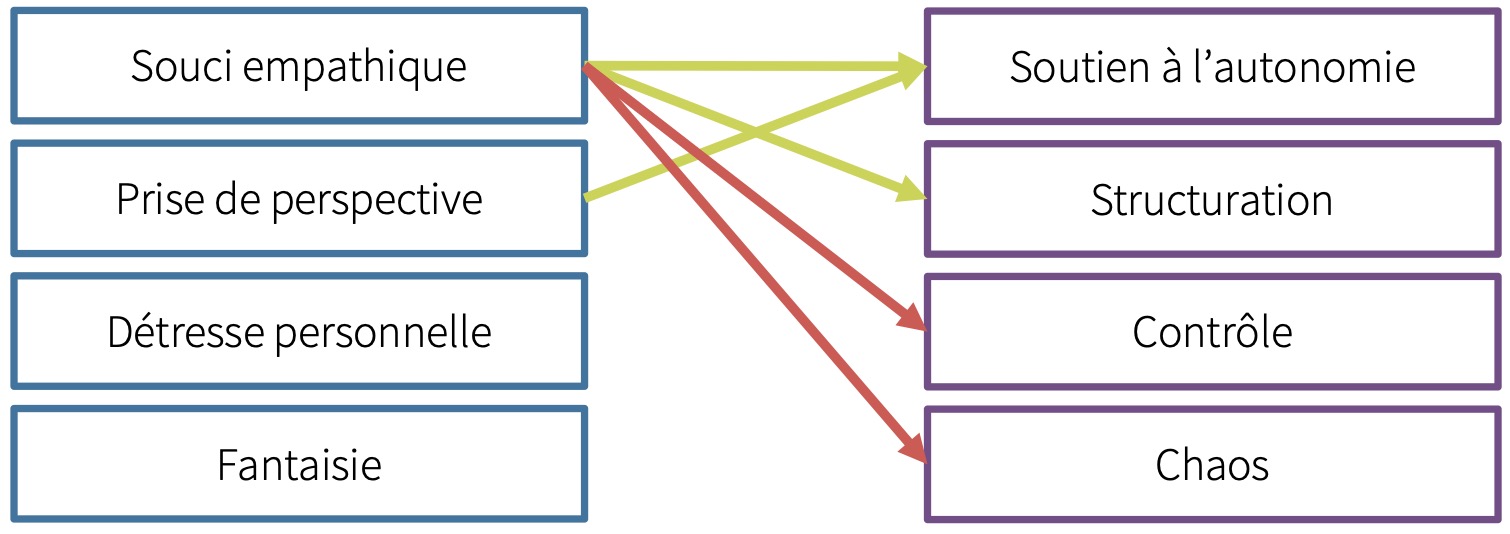 En résumé, on peut affirmer que l’empathie affective est associée à des styles d’enseignement plus efficaces pour le climat et l’apprentissage, c’est-à-dire des styles qui répondent aux besoins psychologiques fondamentaux des élèves. Soulignons en outre que c’est précisément l’aspect affectif de l’empathie qui est associé aux différents styles d’enseignement, ce qui montre que la gestion de la classe est étroitement liée à la manière dont le corps enseignant fait preuve d’empathie envers ses élèves sur le plan affectif (et moins sur le plan cognitif).