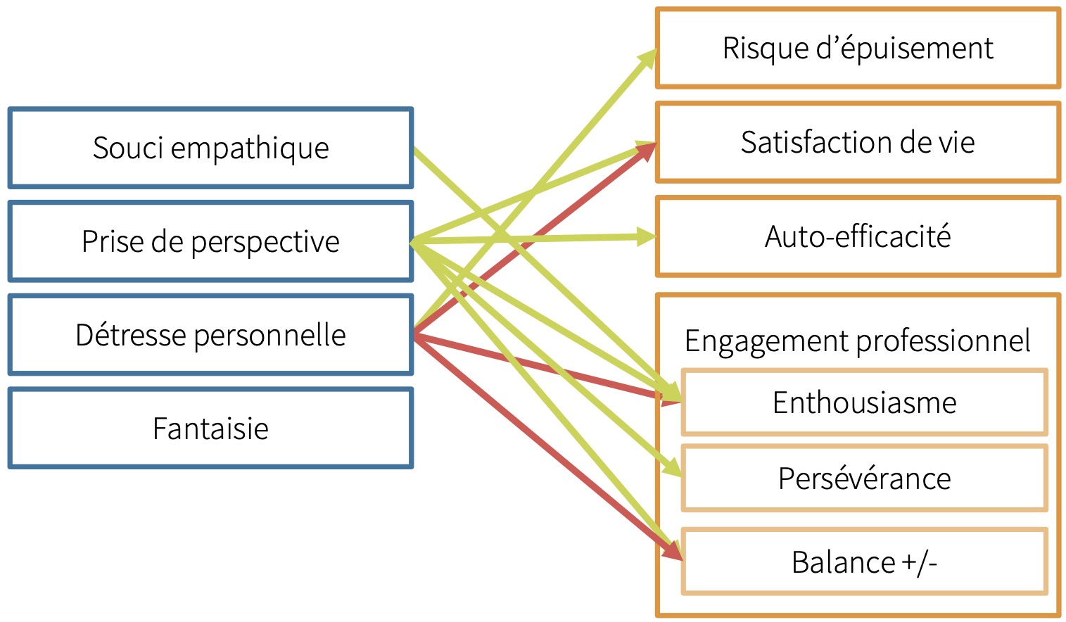 - Risque d’épuisement: la détresse personnelle causée par le fait de subir les émotions désagréables des autres en tant qu’aspect empathique est associé de manière significative (et positive) au risque d’épuisement. En d’autres termes, les enseignantes et enseignants qui rapportent des niveaux plus élevés de détresse personnelle tendent à présenter un risque accru d’épuisement.