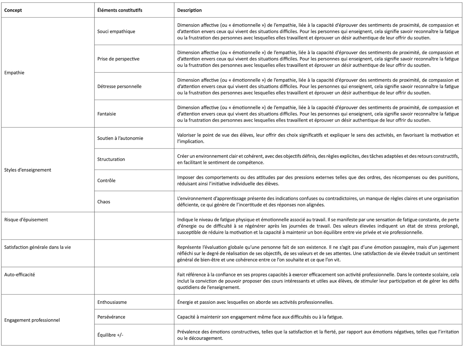De ces descriptions sont nées nos interrogations liées à la recherche menée : de quelle manière l’empathie « interagit-elle » avec d’autres dimensions du vécu professionnel, telles que le bien-être, l’efficacité, le style didactique et le risque d’épuisement ? Et dans quelle mesure des niveaux d’empathie élevés peuvent-ils (ou non) jouer un rôle protecteur pour les personnes qui enseignent ?