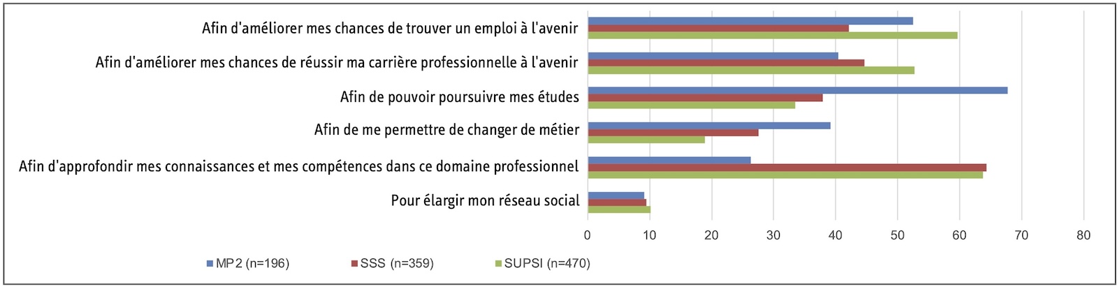 Plus de la moitié des personnes ayant participé à l’étude a porté son choix sur la MP2 en vue de poursuivre sa formation, quand près de 40 % d’entre elles envisageaient un changement de métier (figure 1). Pour les hautes écoles spécialisées et la SUPSI, en revanche, c’est surtout la volonté d’approfondir et d’élargir ses compétences professionnelles qui prime. Une autre motivation qui concerne toutes les filières, et à plus forte raison la SUPSI, est l’amélioration des opportunités d’emploi et de carrière (plus de 40 % des personnes interrogées pour chacune des filières). L’un des motifs poussant certaines personnes en études à poursuivre leur formation est donc le besoin d’élargir ses connaissances et compétences afin de trouver plus tard sa place sur le marché de l’emploi et d’y faire carrière.