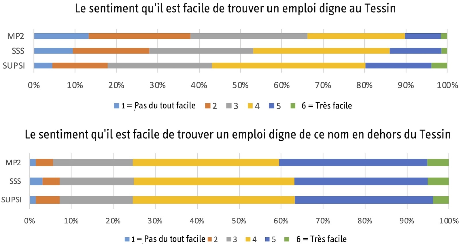 La difficulté d’accès supposée au marché de l’emploi s’exprime, plus encore que dans les autres régions, dans le peu d’optimisme affiché à l’idée de trouver un emploi décent dans le Tessin, c’est-à-dire un emploi offrant une sécurité physique et psychologique, une rémunération équitable ainsi qu’un temps de repos suffisant tout en correspondant à ses valeurs (Duffy et al., 2016 ; figure 2).