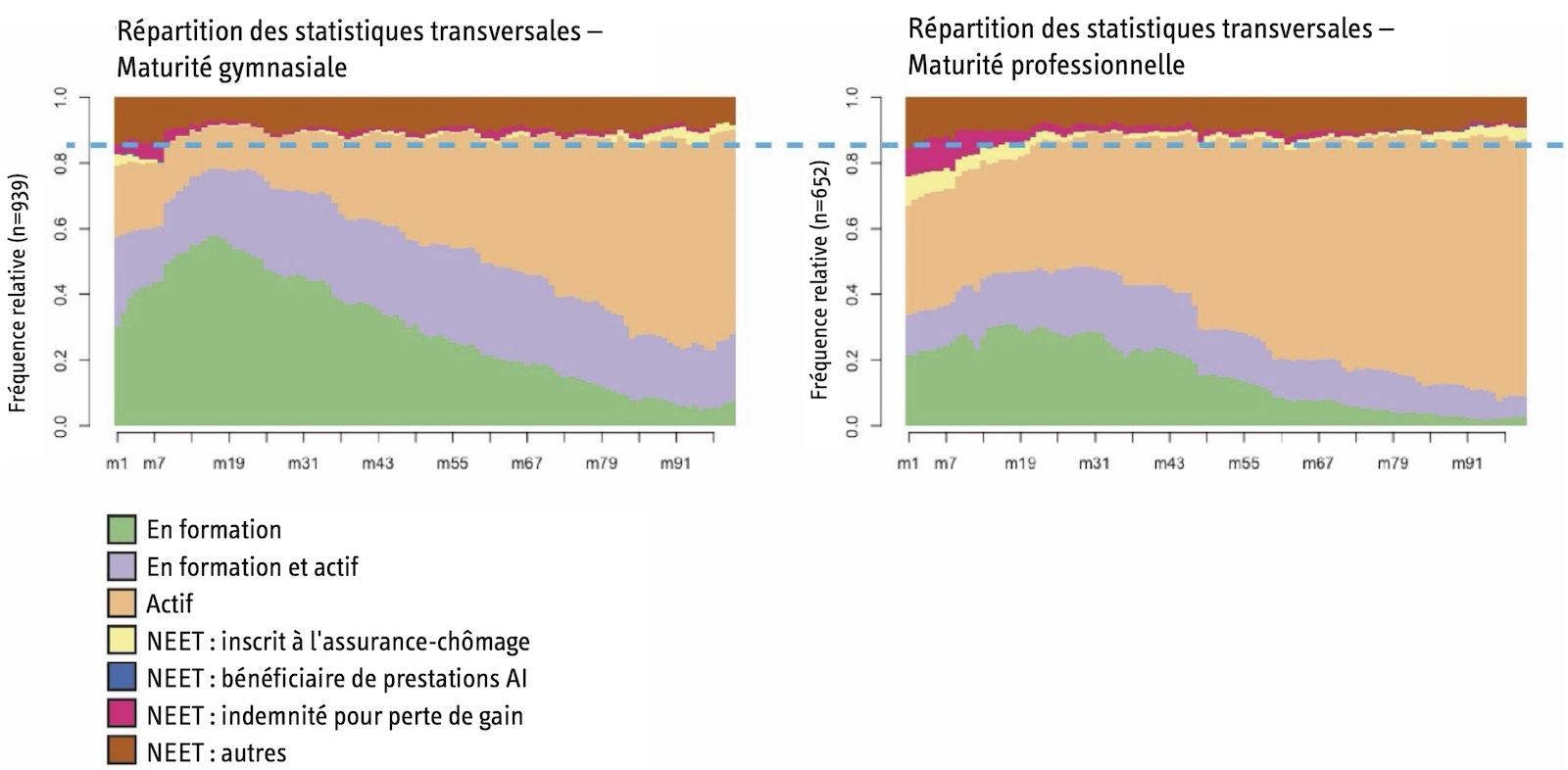 La ligne pointillée bleue se stabilisant vers 0,85 montre que, pour chacun des deux groupes, la part cumulative de toutes les personnes ne relevant pas du groupe NEET se stabilise à un niveau comparable vers la quatrième année d’observation environ. Malgré des parcours différents suivis (sachant que les personnes diplômées d’un gymnase restent plus longtemps dans le parcours de formation académique), la part des personnes se trouvant dans une situation NEET est donc sur le long terme essentiellement la même dans les groupes. Cela montre qu’en dépit des logiques différentes poursuivies par les formations professionnelles et les formations académiques, toutes deux mènent, et dans des proportions similaires, vers la formation et l’emploi.