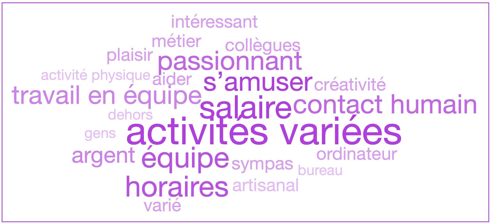 Le nuage de mots reproduit dans la figure 3, qui vient compléter les figures 1 et 2, montre très clairement à quoi les jeunes associent spontanément l’attractivité d’un métier. On leur a posé la question ouverte suivante : « Qu’est-ce qui, selon toi, rend un métier attirant ? » Au centre du nuage, on distingue les associations « activités variées » et « s’amuser », deux expressions dénotant un profond besoin d’avoir une motivation intrinsèque, d’exercer un métier qui a du sens et de vivre des expériences quotidiennes. La question du salaire apparaît très nettement elle aussi, ce qui montre que l’attractivité d’un métier passe également par une certaine reconnaissance matérielle aux yeux des jeunes. La proéminence des associations de nature sociale comme « équipe », « travail en équipe » et « contact humain » attire l’attention également. Ainsi, le métier exercé ne doit pas isoler, mais doit déboucher sur un sentiment d’appartenance, un travail collectif de qualité et de bonnes relations humaines. L’entrecroisement de ces dimensions sociales recoupe les résultats portant sur les contenus exposés précédemment. Le nuage de mots laisse également apparaître la volonté d’avoir de bons horaires de travail, venant ainsi une nouvelle fois souligner l’importance de l’organisation et de la possibilité de conjuguer vie privée et vie professionnelle. Dans l’ensemble, le nuage de mots montre que les jeunes associent avant tout l’attractivité d’un métier au fait d’exercer des activités variées, à la présence d’un bon climat social dans l’entreprise, à une rémunération juste ainsi qu’à des conditions de travail adaptées à la vie de tous les jours, et que les questions liées au statut et aux traditions familiales jouent un rôle moins significatif.