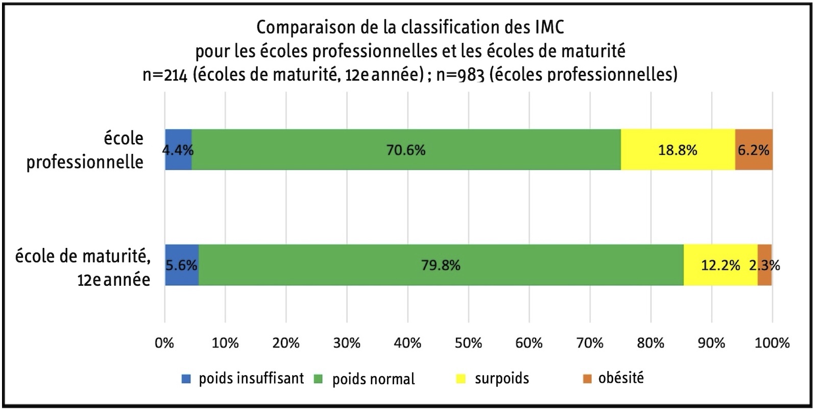 Figure 1 : comparaison de la répartition en pourcentage de la classification des IMC des élèves en troisième année d’apprentissage et des élèves en douzième année d’école de maturité.