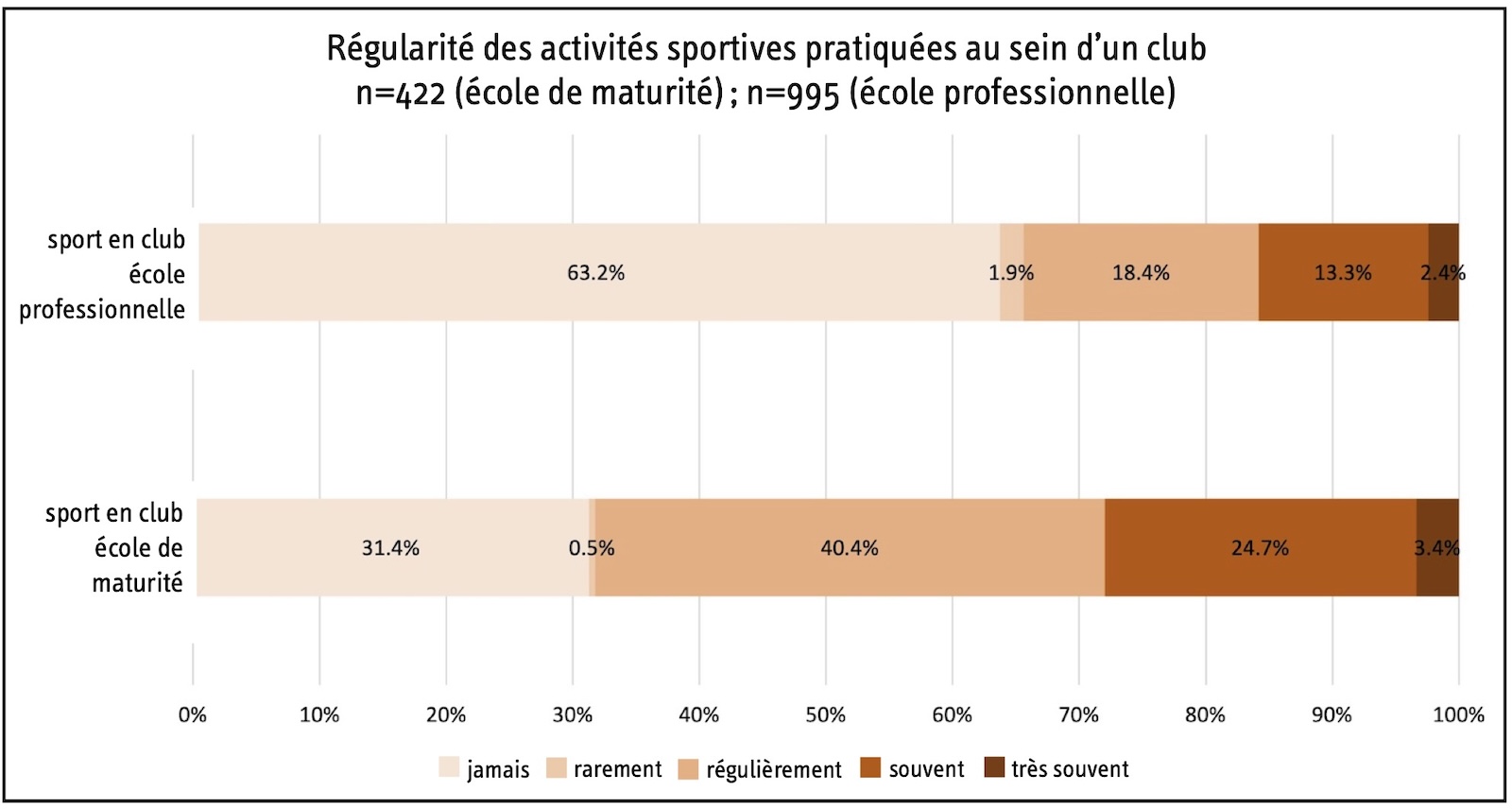 Figure 3 : comparaison de la régularité des activités sportives pratiquées au sein d’un club par les élèves des écoles de maturité et les élèves des écoles professionnelles.