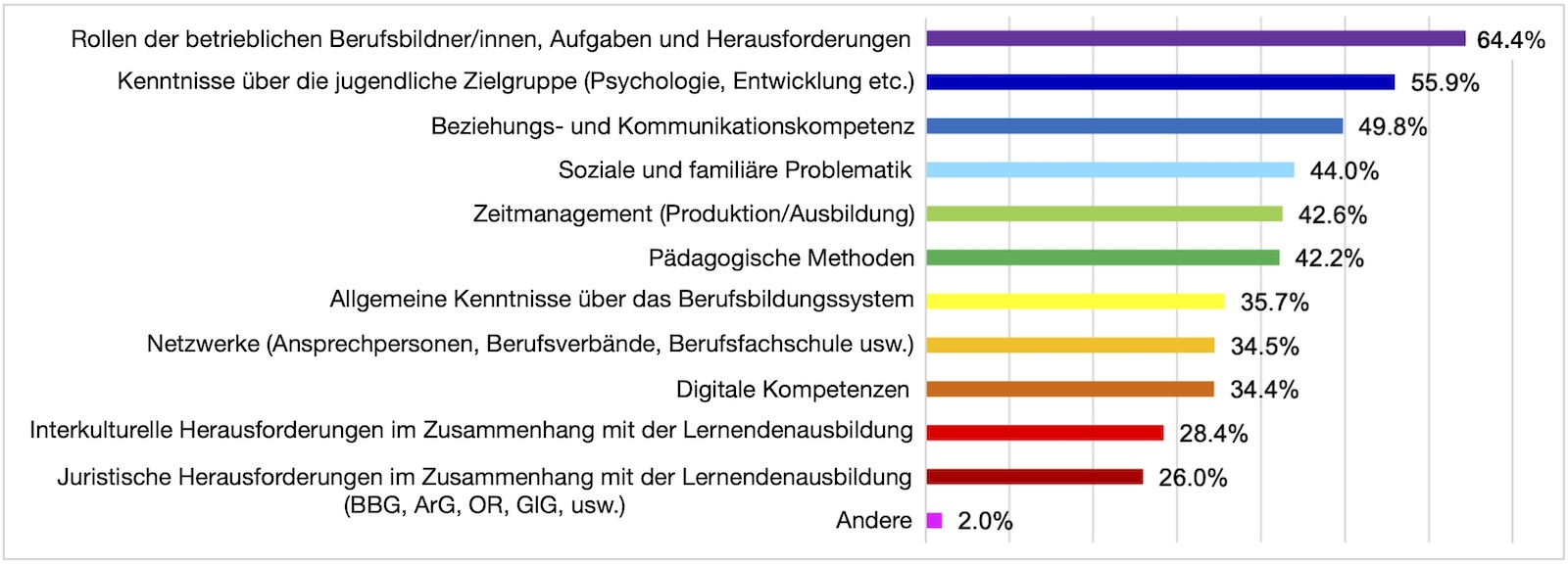 Aufgrund ihrer Doppelfunktion haben die Berufsbildnerinnen auch einen zweifachen Weiterbildungsbedarf: für ihren eigentlichen Beruf und für die ausbildende Tätigkeit. Der vorliegende Beitrag beleuchtet diesen Weiterbildungsbedarf. Grundlage des Textes[1] bildet ein im Rahmen von «Berufsbildung 2030» finanziertes Projekt der Stiftung Top-Ausbildungsbetriebe, das inzwischen zur Entwicklung des Bildungsgangs «SwissEduPro» geführt hat. Hinweise zur Erhebungsmethode und vertiefende Ergebnisse finden sich im Schlussbericht des Projekts (Wenger & Lamamra, 2024).