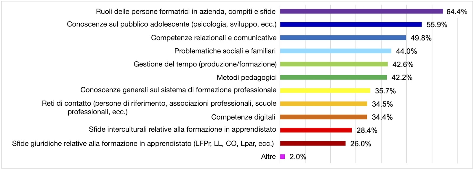 Emergono principalmente tre tematiche per cui ha dimostrato interesse una percentuale delle persone intervistate compresa tra il 50% e il 65% e che sottolineano le sfide centrali riscontrate dalle persone formatrici. Al primo posto, la complessità legata ai numerosi Ruoli, compiti e sfide, nonché alla necessità di delimitare i confini tra i diversi ruoli (Lamamra et al., 2019; Bahl, 2019). Il tema relativo alle Conoscenze sul pubblico adolescente sottolinea che, oltre al lavoro di trasmissione di conoscenze, è importante accompagnare le giovani generazioni con le loro peculiarità e nelle loro sfide specifiche, che si tratti del passaggio dalla scuola alla professione o nel percorso verso la vita adulta. L’importanza delle Competenze relazionali e comunicative dimostra che questa dimensione è di fondamentale importanza per la qualità della formazione e per determinare che le persone decidano di continuare il percorso di formazione (Masdonati & Lamamra 2009; Berger et al., 2019).