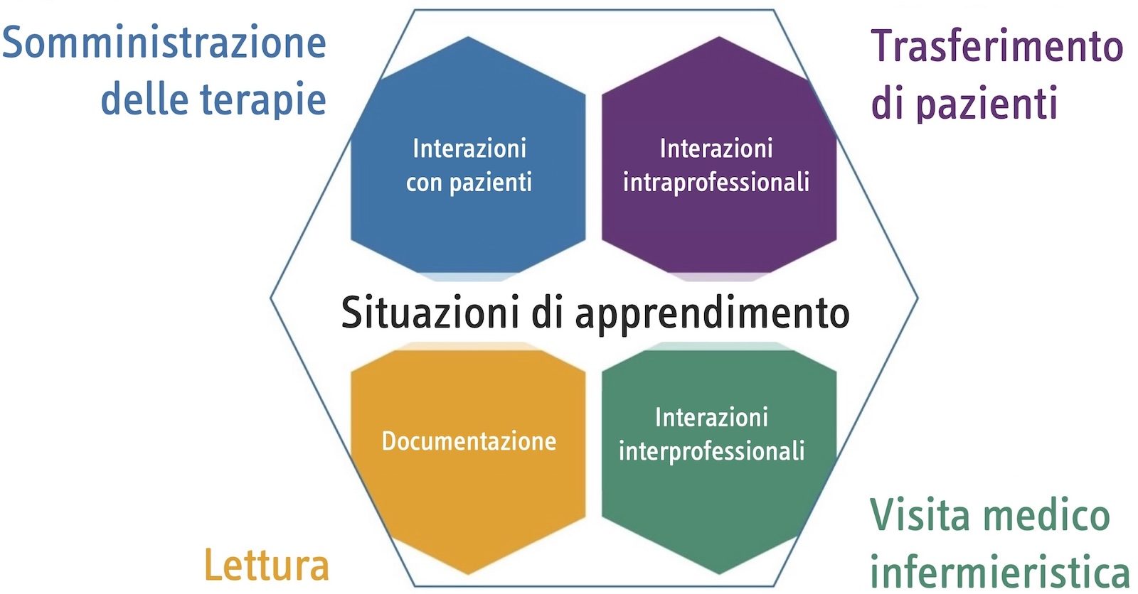 La situazione d’apprendimento relativa a una visita medico-infermieristica viene descritta nel modo seguente: nel terzo giorno successivo all’intervento, il medico assistente e l’infermiere entrano nella stanza di una paziente. Mentre l’infermiere è ai piedi del letto munito del suo carrello infermieristico e legge le annotazioni sulla sua lista pazienti cartacea, il medico assistente chiede alla paziente come si senta. La paziente risponde che sta molto meglio e che si sente più autonoma nei movimenti. Il medico assistente le conferma allora che sarà presto trasferita al reparto di riabilitazione. Nel frattempo, l’infermiere constata che un’assistente sociale ha già registrato la paziente nel reparto di riabilitazione. Questa informazione verrà però comunicata al medico assistente solo dopo la visita. Durante la visita il medico assistente informa la paziente che dovrà assumere un antibiotico per dieci giorni. In seguito, la paziente chiede di ricevere più antidolorifici, poiché da quando sono state cambiate le compresse avverte più dolore. L’infermiere vede dal grafico di cura relativo alla paziente che da alcuni giorni riceve una dose inferiore di ibuprofene e conferma che da allora ha chiesto più volte antidolorifici aggiuntivi. Il medico assistente decide quindi di aumentare nuovamente la dose e chiede all’infermiere di inviargli un “messaggio importante” in merito attraverso l’apposita funzione prevista nel sistema informativo clinico. Infine, il medico assistente chiede brevemente alla paziente se abbia delle reazioni allergiche agli antibiotici prescritti.