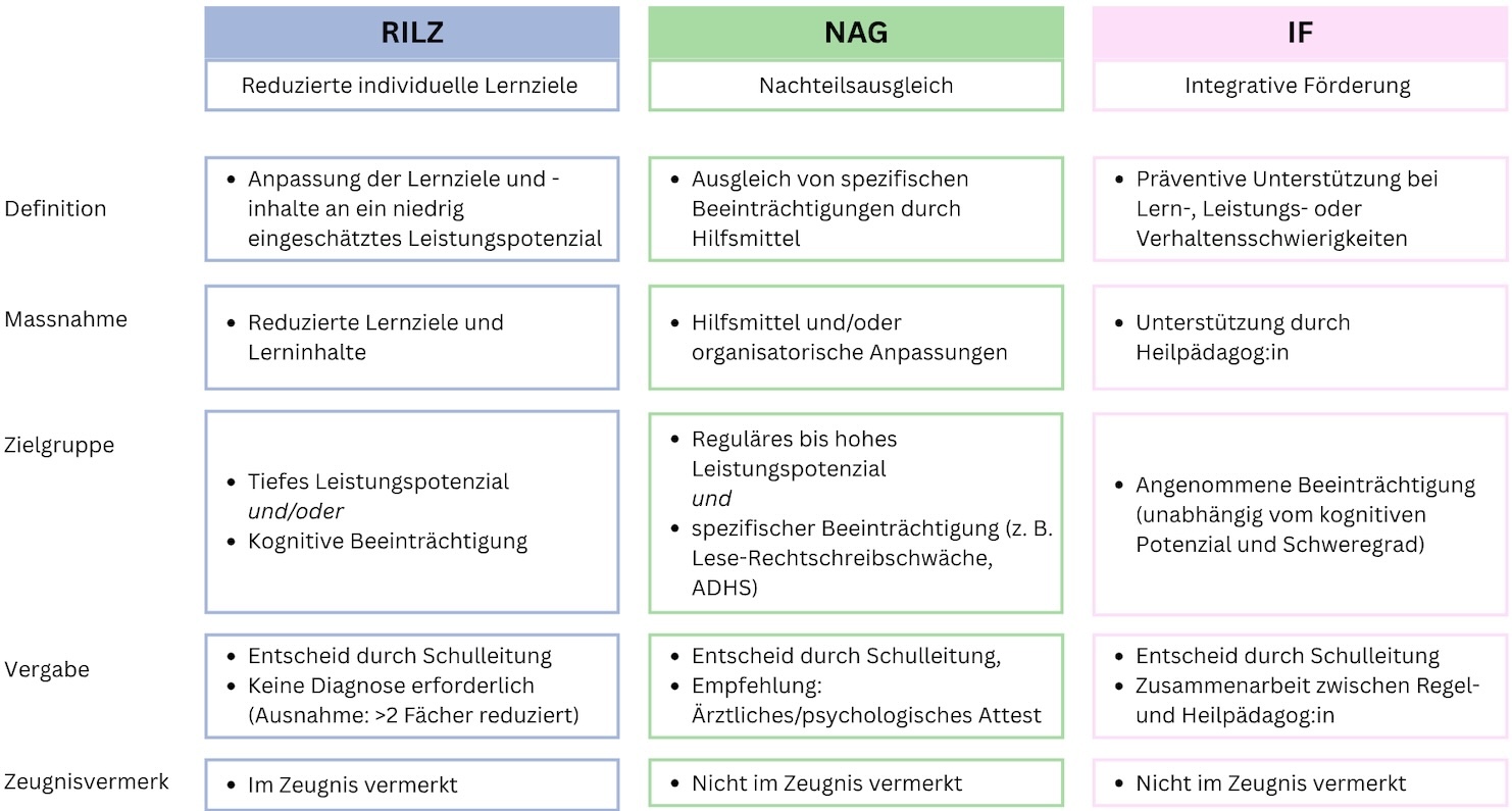 Zusätzliche Befunde zeigen, dass die Schulleistungsentwicklung von Lernenden mit RILZ negativer ausfällt als jene von vergleichbaren Lernenden ohne RILZ. Lernende mit einem NAG hingegen weisen sogar eine etwas positivere Schulleistungsentwicklung auf als vergleichbare Lernende ohne NAG (Sahli Lozano et al., 2023b). Zudem unterschätzen Lehrpersonen die kognitiven Fähigkeiten von Lernenden mit RILZ (Sahli Lozano et al., 2022).