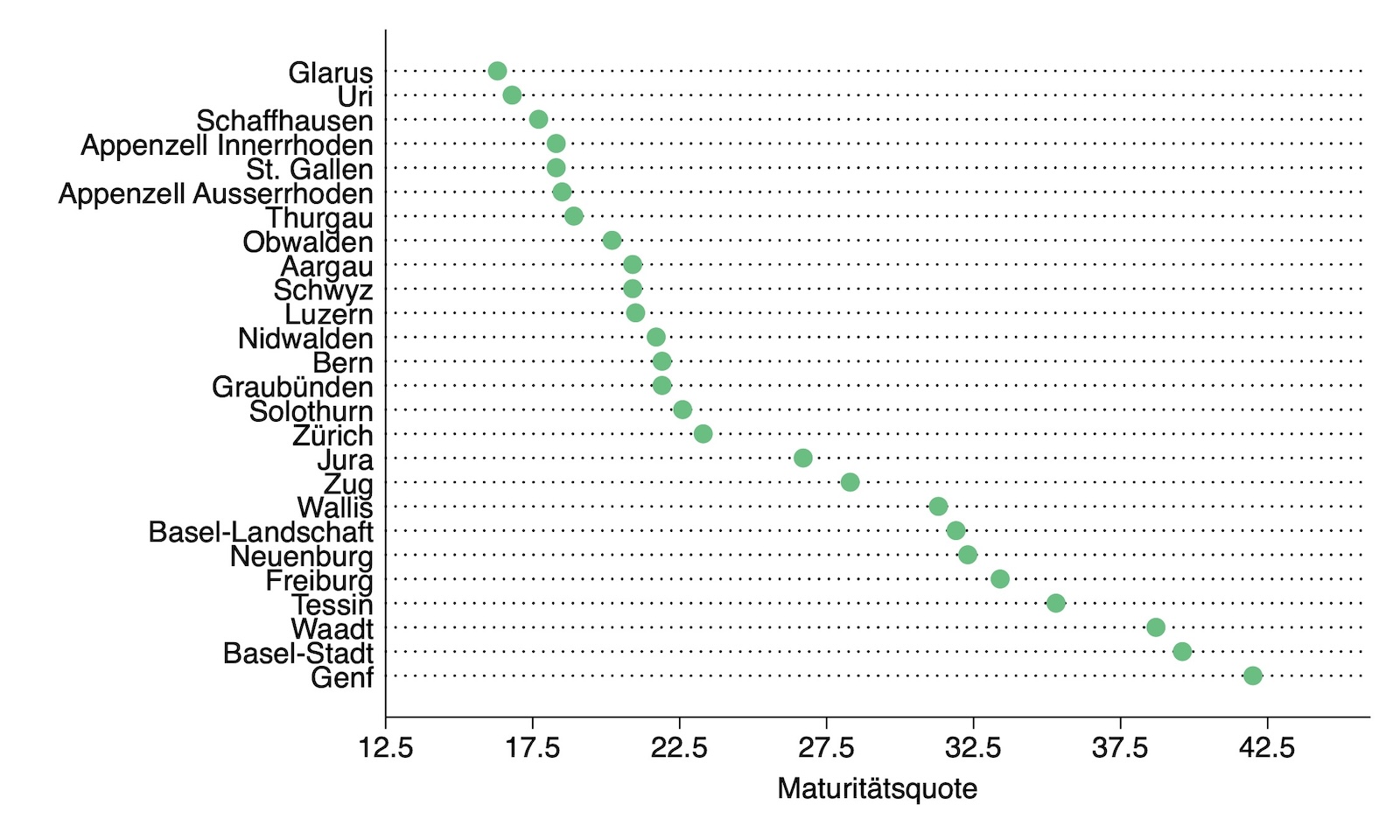 «Was» oder «wer» also die kantonalen Unterschiede der Maturitätsquoten verursacht, lässt sich anhand der verwendeten Daten zwar nicht abschliessend klären. Die Daten deuten aber darauf hin, dass dafür ökonomische, sprachkulturelle sowie politische Faktoren relevant sind.[4]