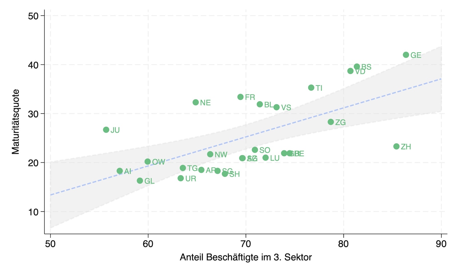 Dennoch verbleibt ein substanzieller Teil der Variation in der Maturitätsquote, der durch andere Faktoren erklärt werden muss; in Abbildung 2 äussert sich das daran, dass viele der Datenpunkte ausserhalb des Konfidenzintervalls liegen. Konkret gibt es viele Kantone, die eine deutlich tiefere Maturitätsquote aufweisen als der Beschäftigungsanteil im dritten Sektor voraussagen würde, und umgekehrt. Am offensichtlichsten wird dies im Vergleich der Kantone Zürich und Genf, die einen ähnlich hohen Anteil an Beschäftigten im dritten Sektor, aber eine sehr unterschiedlich hohe Maturitätsquote aufweisen.