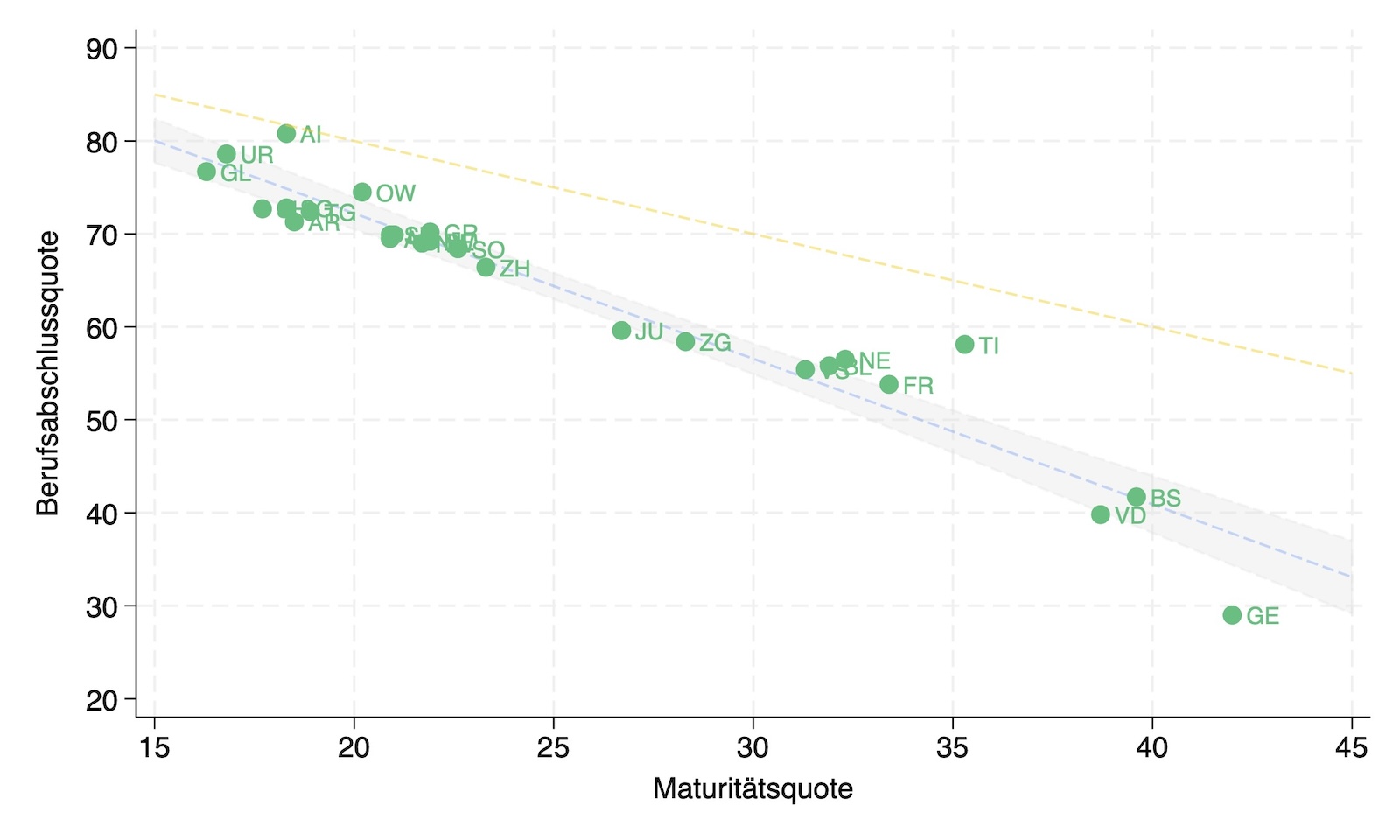 Ich betrachte nun die möglichen Auswirkungen dieser kantonalen Unterschiede. Dafür beschreibe ich zunächst den ebenso fundamentalen wie offensichtlichen «trade-off» auf der aggregierten Ebene. Dieser besteht wie erwähnt darin, dass sich die Wahl einer allgemein- und einer berufsbildenden Ausbildung ausschliessen. Auf der aggregierten (d.h. kantonalen) Ebene korrelieren die beiden Quoten darum zwingend negativ miteinander (vgl. Abbildung 3, die Korrelation der beiden Quoten beträgt -0,963); auf die gelb gestrichelte Linie komme ich weiter unten zu sprechen.