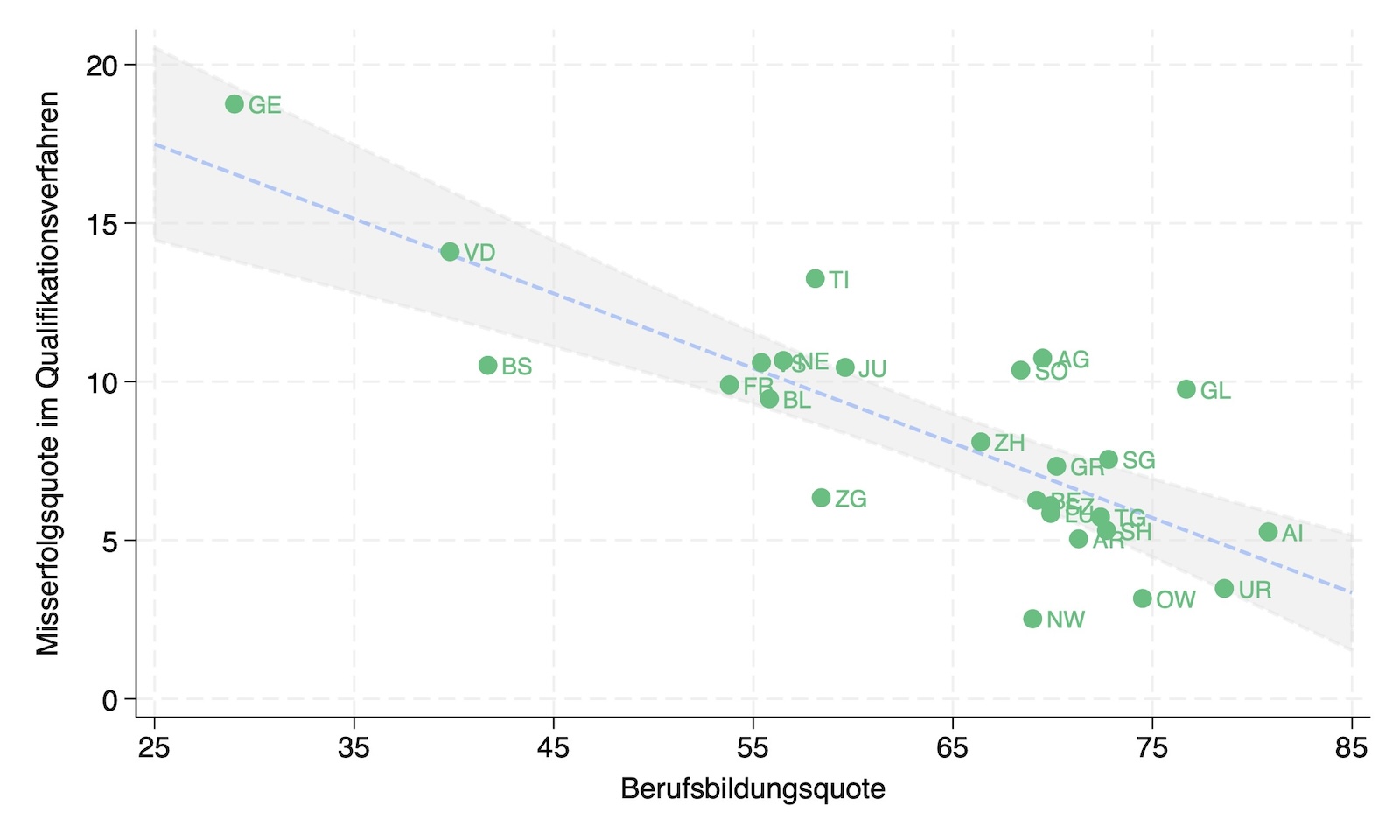 Je stärker die Berufsbildung in einem Kanton ist, desto geringer ist der Anteil der Jugendlichen, die im QV scheitern.