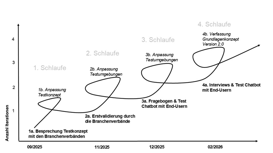Die Entwicklungs- und Erprobungsphase des Weiterbildungs-Chatbots dauerte von Juli 2025 bis April 2026. In dieser Zeit wurden vier Iterationen (Schlaufen) durchgeführt (vgl. Abb. 1). Dabei haben verschiedene Stakeholder wie Vertreterinnen verschiedener Berufsverbände und potenzielle Nutzerinnen der Weiterbildungsberatung (Personas gemäss Grundlagenkonzept) den Weiterbildungs-Chatbot mehrmals getestet und validierte Erkenntnisse flossen in die Weiterentwicklung des Chatbots.