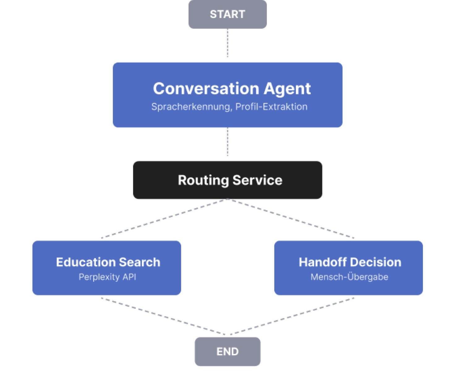 Diese Erkenntnisse rechtfertigen die Abkehr von einem anfänglich konzipierten zentralen, gepflegten Knowledge Graph zu einer dezentralisierten Web-Suche mit Prompt-Engineering. Die neue Architektur verbessert Skalierbarkeit und Wartungsfreiheit, schränkt jedoch die Auditierbarkeit einzelner Datenpunkte ein. In Bezug auf die Triagierung wurden gemeinsam mit den Verbänden Triage-Kriterien (z. B. Auskünfte zu Prüfungen oder Gleichwertigkeitsanfragen) definiert und im Modell implementiert. Darüber hinaus weist das Modell im Verlauf des Gesprächs nach drei Interaktionen auf die Möglichkeit eines persönlichen Gesprächs hin. Zusammengefasst veranschaulicht Abbildung 2 die Architektur des Weiterbildungs-Chatbots. Die Benutzeranfrage führt einerseits zu einer KI-basierten Verarbeitung einfacher und häufiger Fragen, die automatisiert beantwortet werden, und andererseits zur gezielten Weiterleitung komplexerer Anliegen an eine menschliche Beratungsperson.