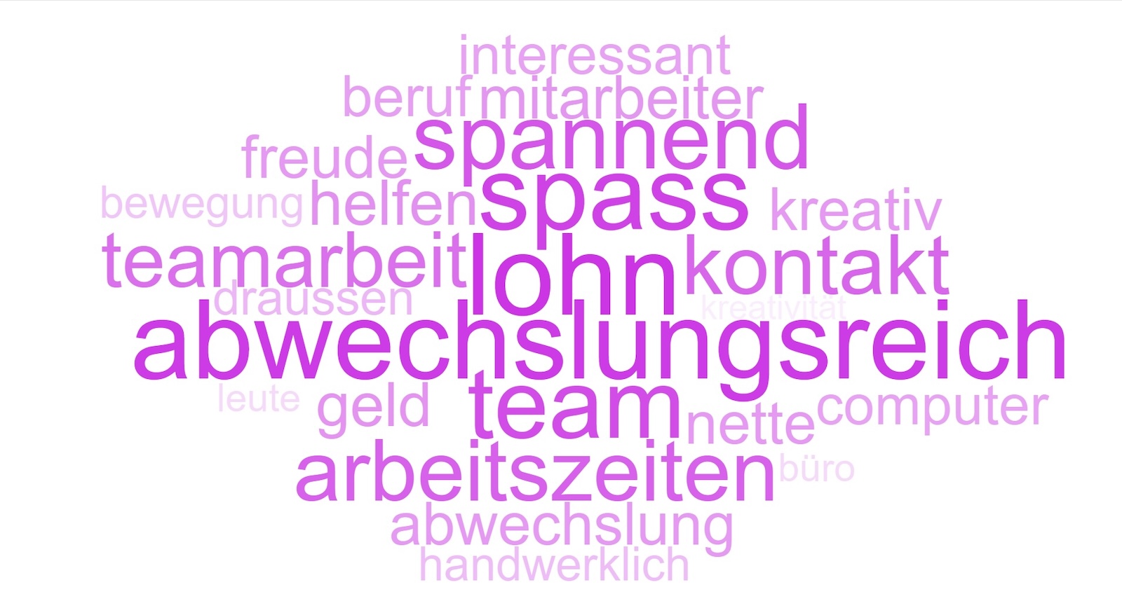Ergänzend zu Abbildungen 1 und 2 zeigt die Wortwolke in Abbildung 3 sehr deutlich, welche spontanen Assoziationen Jugendliche mit attraktiven Berufen verbinden. Sie wurden hierzu offen gefragt: «Was macht deiner Meinung nach einen Beruf attraktiv?» Im Zentrum dieser Assoziationen stehen «abwechslungsreiche Tätigkeiten» und «Spass» an der Arbeit. Zwei Begriffe, die auf ein starkes Bedürfnis nach intrinsischer Motivation, Sinn und Alltagserlebnis hinweisen. Gleichzeitig ist der Lohn sehr prominent vertreten. Dies zeigt, dass attraktive Berufe für Jugendliche auch eine gewisse materielle Anerkennung beinhalten. Auffällig ist zudem die starke Präsenz sozialer Aspekte wie Team, Teamarbeit und Kontakt. Ein Beruf soll nicht isolieren, sondern Zugehörigkeit, gute Zusammenarbeit und positive Beziehungen ermöglichen. Das Durchdringen dieser sozialen Komponente deckt sich mit den zuvor geschilderten Umfrageergebnissen zu den Berufsinhalten. Ergänzt wird dieses Bild durch Hinweise auf gute Arbeitszeiten, was die Bedeutung von Planbarkeit und Vereinbarkeit nochmals unterstreicht. Insgesamt spiegelt die Wortwolke damit wider, dass Jugendliche Attraktivität primär mit Abwechslung, gutem sozialen Klima, fairer Entlohnung und alltagstauglichen Arbeitsbedingungen und weniger mit Status oder Familientradition verbinden.